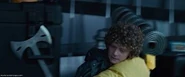 Passend zu Distrikt 4, der für Fischerei zuständig ist, tragen er und seine Mittributin Tara blaue Kostüme, auf den Schultern Seesterne, und im Haar schimmernden Perlen.